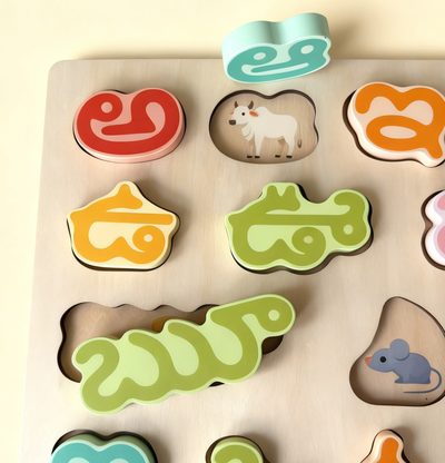 The puzzle introduces Telugu letter forms through shape matching, repetition, and parent-led naming games. It supports hand strength, visual discrimination, and early reading readiness.